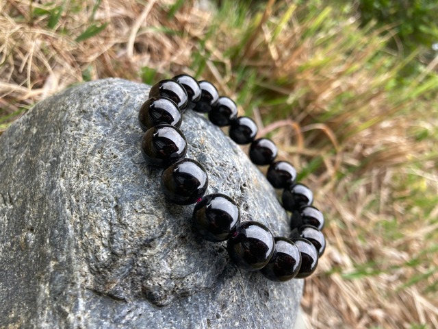 【紅蓮の深淵なる漆黒】ガーネット約12.5㎜ 腕周り:17.5㎜ ほぼ漆黒のガーネットリピーター様、大絶賛です。 宝石言葉「実行力の勝利」と言われ、行動や成果が実を結ぶことの象徴と考えられています。ガーネット類全般には「実り」という宝石言葉が挙げられ、物事の成功や友情あるいは愛情の象徴で人類史でも古くからその名を刻む石でもあります。ガーネットは積極的行動、自分からアクションを起こして物事を変化させたいと考えている方にとっての追い風となるパワーストーンというか追い炎のような炎属性と云えます。古代ローマでも「戦士の石、闘神マルスの石」とも呼ばれ、戦いの御守りとして兵士たちが持ち歩いていた石でもあります。 ガーネットはストレスに対する緩和にとても強く、また、場合によっては正当な怒りや戦いを選択してくれる石でもあり、お仕事でも非常に頼もしい存在で、ストレスフル社会において必須な石のひとつといえます。 一般的なショップではなかなかその効果の発揮が感じられにくく、また苦手と捉える方も多い石でもありますが、当店は現代のマストと考えている石のひとつでもあり、そのすばらしさは今まで、 お客様のオーディエンスも抜群の石でもあります。実に頼もしい石のひとつ。 ※生命力を高める ※情熱を高める ※地道な努力が実を結ぶ ※忍耐力を養う ※正当に評価されるようになる ※うつ改善 ※勇気とやる気を与える ※一途な愛情を高める 浄化方法は全て適用できます。 ※ガーネット類は柘榴石とも言われ、劈開性質がありますゆえ、傷のように見えたり凹みのように見える石があります。予めご承知おきください。 このガーネットはガーネット類の中でも 透過性がなく光を当てても黒く見えるほど 一部赤みでガーネットと確認は出来るでしょう。 そういった背景もあり魔除けとしても抜群に強く、また闘気を十分に養える活力性も抜群にある逸品です。 戦士の石として名高いガーネットですが、こちらはさらに抜群のまさに戦いの石。ストレスマックスな人のストレス耐性にも大きく付与されると思います。 これぞ戦神マルスでしょと思う次第です。