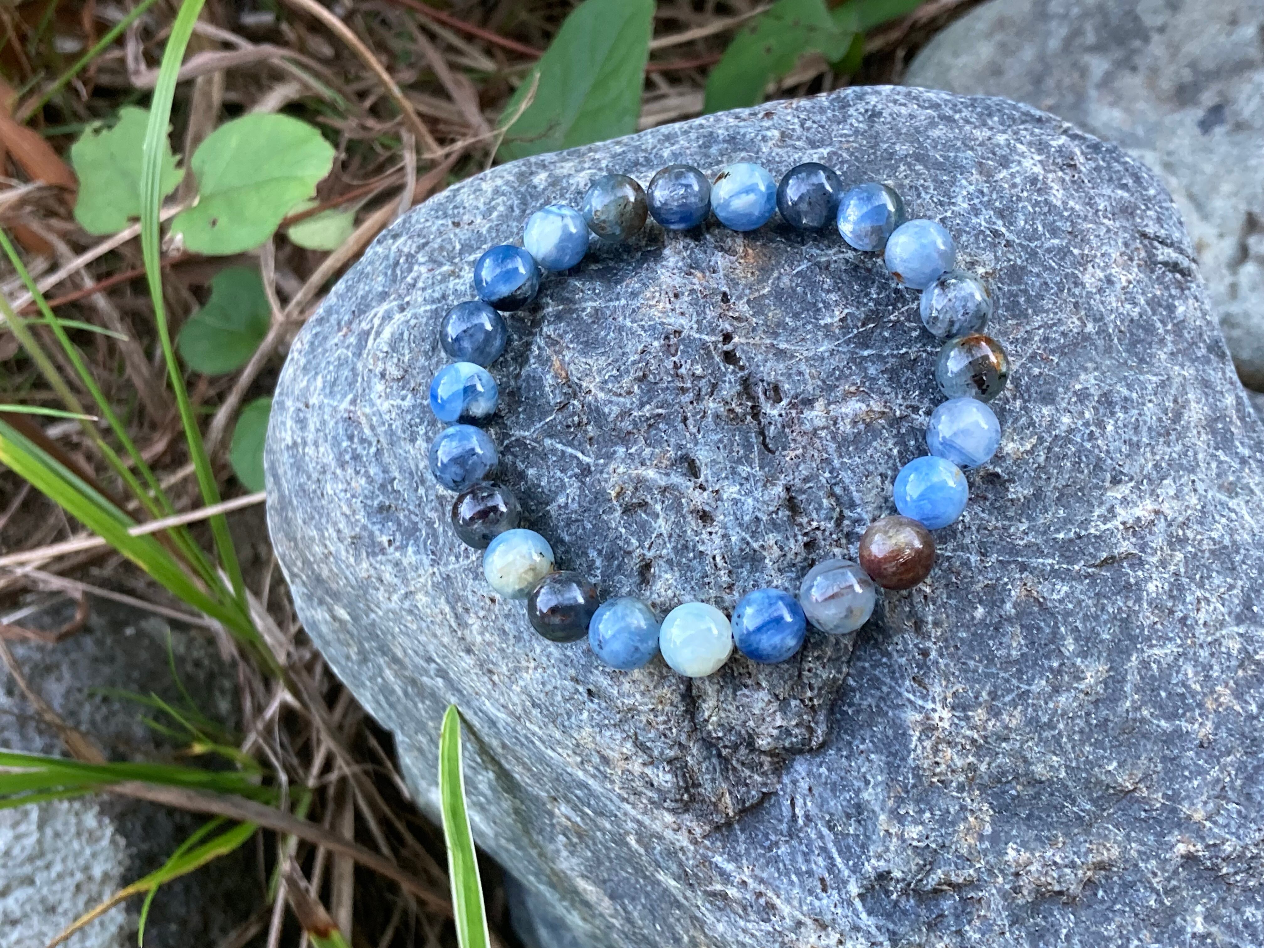 マイカインカイヤナイトは、カイヤナイト(藍晶石)とマイカ(雲母)が共生している天然石です。カイヤナイトの深い青色と、マイカのキラキラとした輝きが特徴です。精神的な安定や直感力を高める効果があるとされ、依存心や甘えをなくし、独立心や探究心を強め固定概念を外したり悪習慣を遠ざけることによって、持つ人の世界観を確立するのに補助する石で、希望の石、明晰化担当なお石さんで悪習慣を手放しやすくし、先の見えない未来の明晰化を徐々に図ってゆくと言う希望の石達の中でも先の見えない霧の中の不安を少なくするアプローチを持っていますと言えるでしょう数ある希望の石と呼ばれる石達での中距離感を担当すると言えるでしょう^ ^