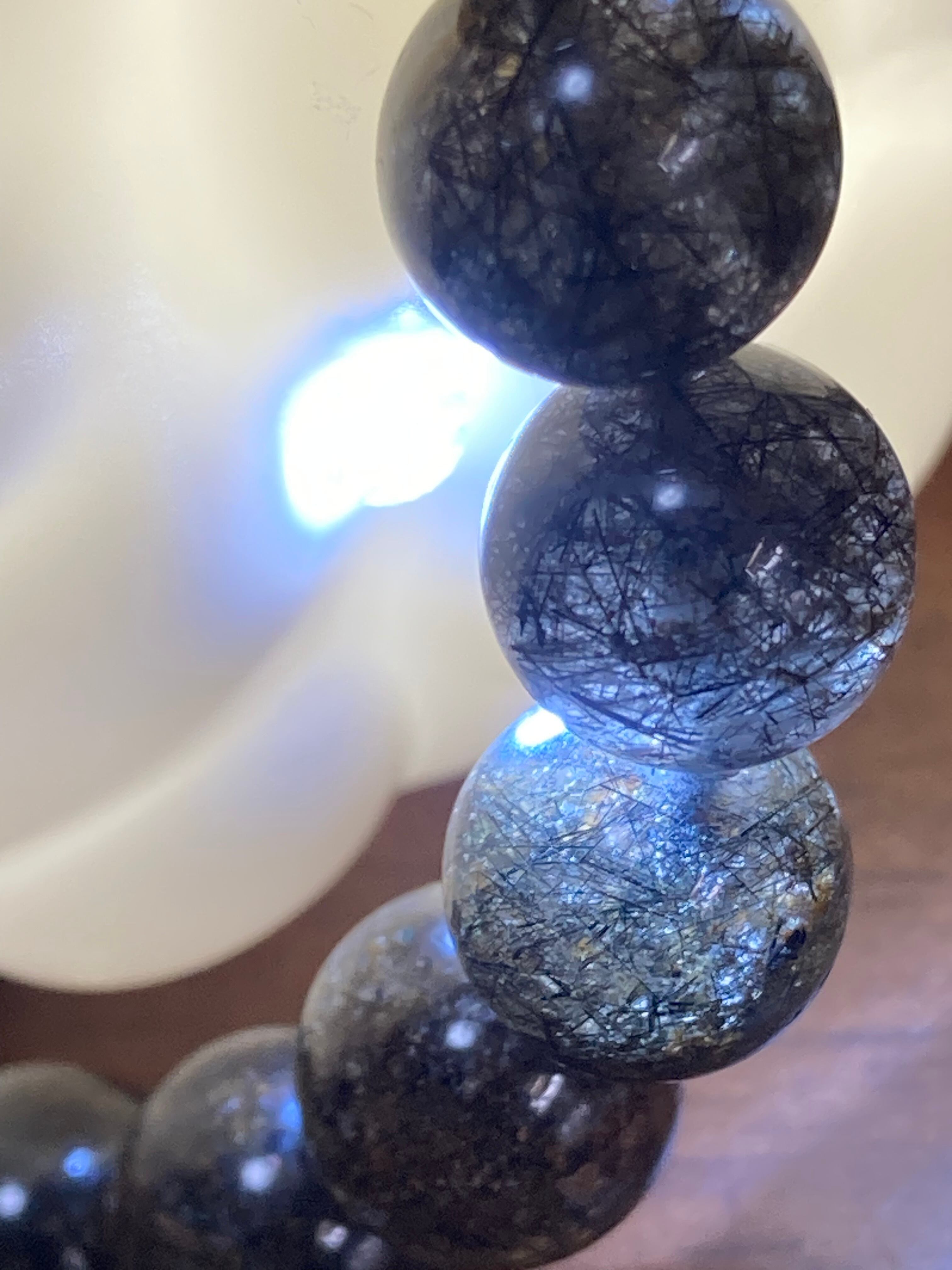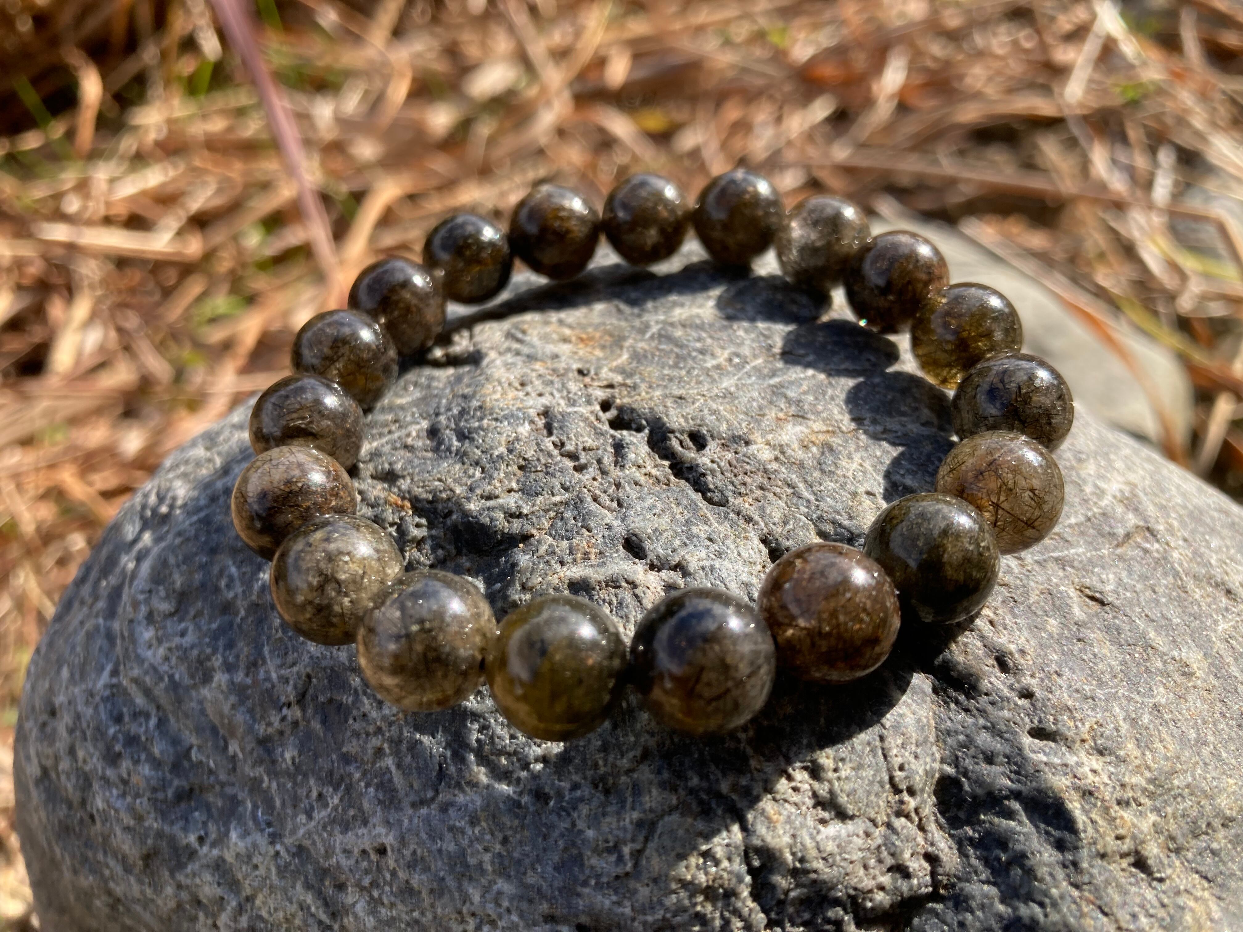 グリーンルチルは、現実感覚が保てない人にオススメの石で、コンピューターなどの仮想現実に生きている人を現実社会に引き戻し、生活になじめるようにサポートする石^ ^このブレスは内包部が褐色混じりのグリーンルチルで特にその特長がさらに顕著にでるでしょう^ ^