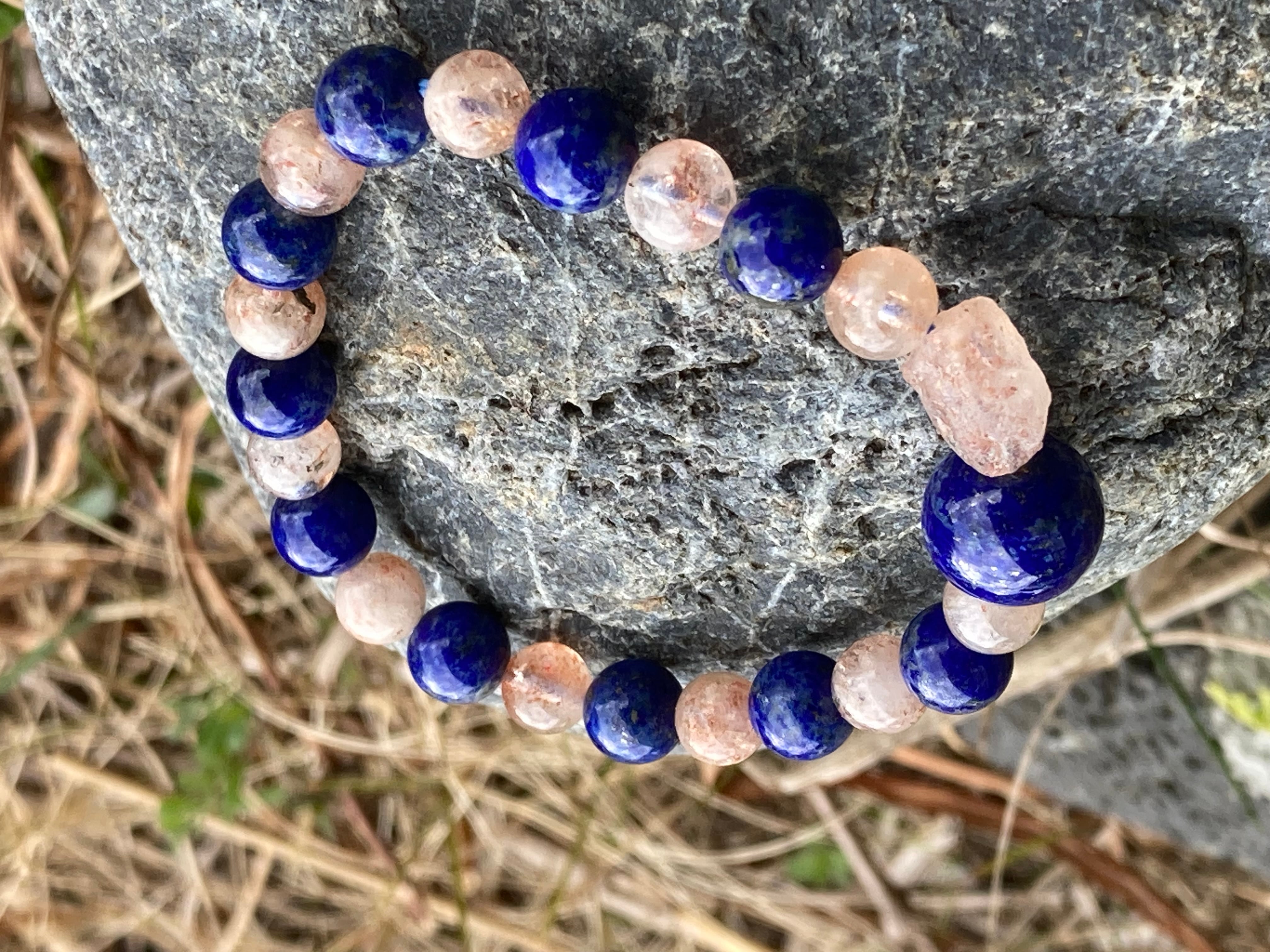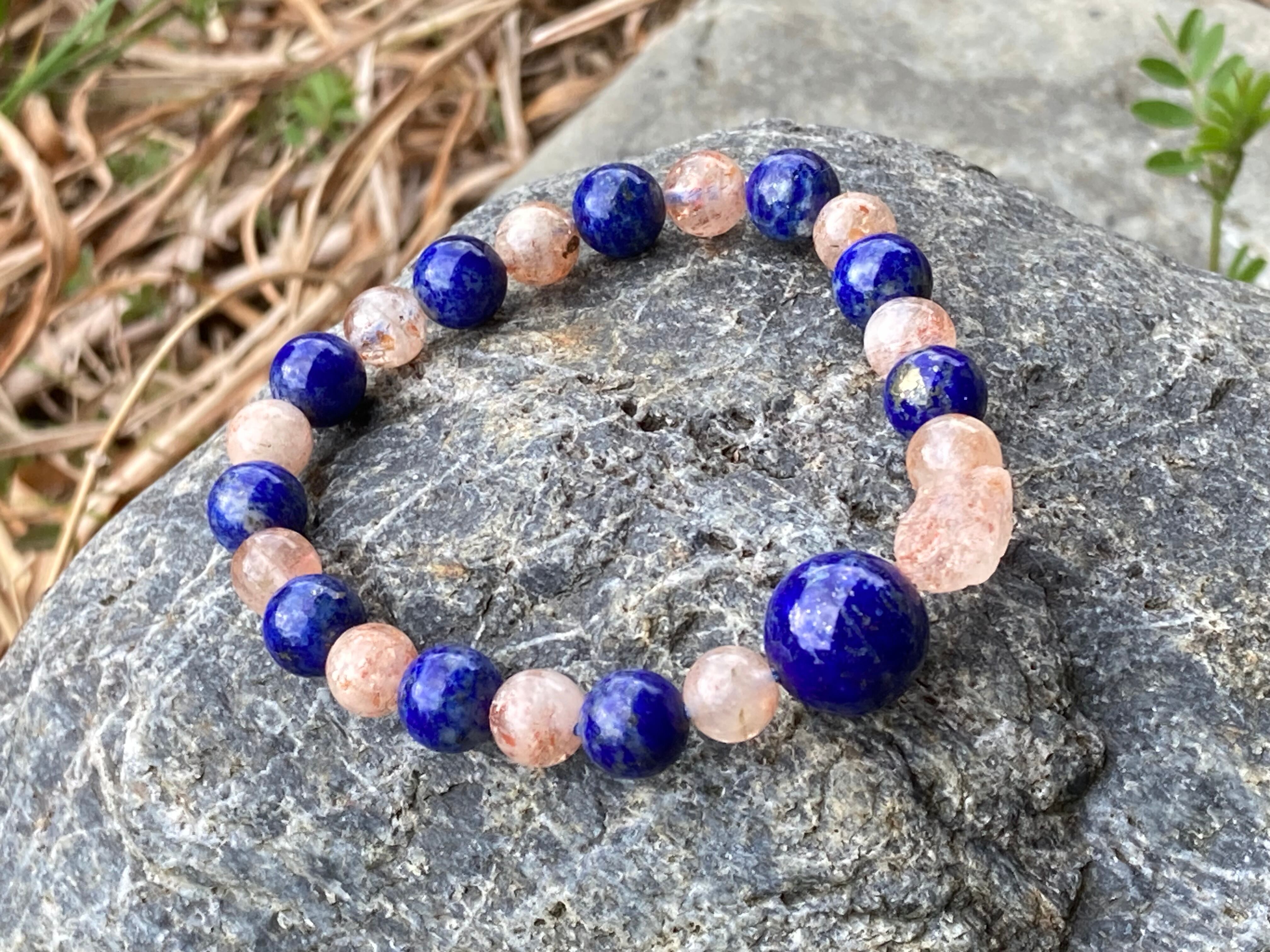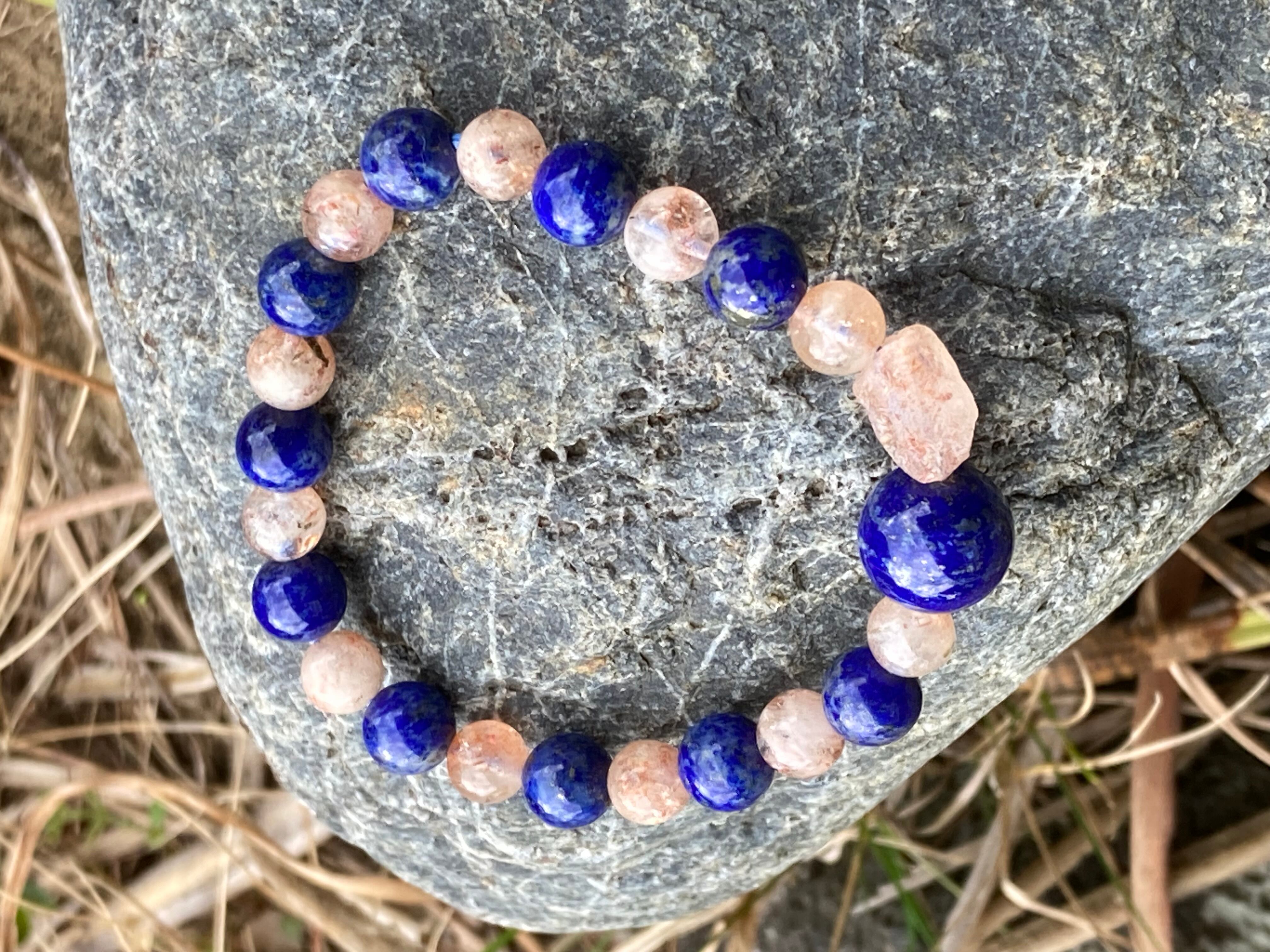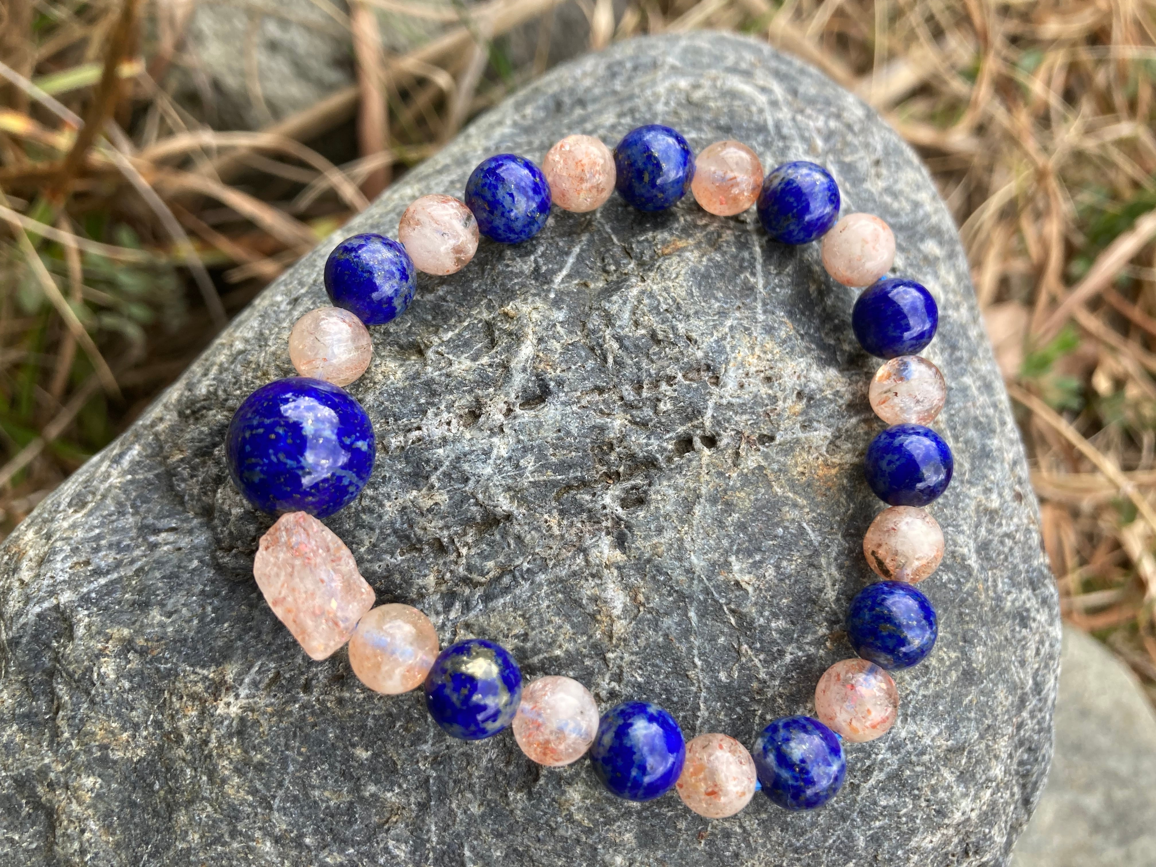 太陽の石であるサンストーン、サンストーンの良さを高めるラフ原石、エジプト文明で最古文献で登場する最初の人々に認知されたパワーストーンとして知られるラピスラズリを組み合わせたブレスです。