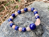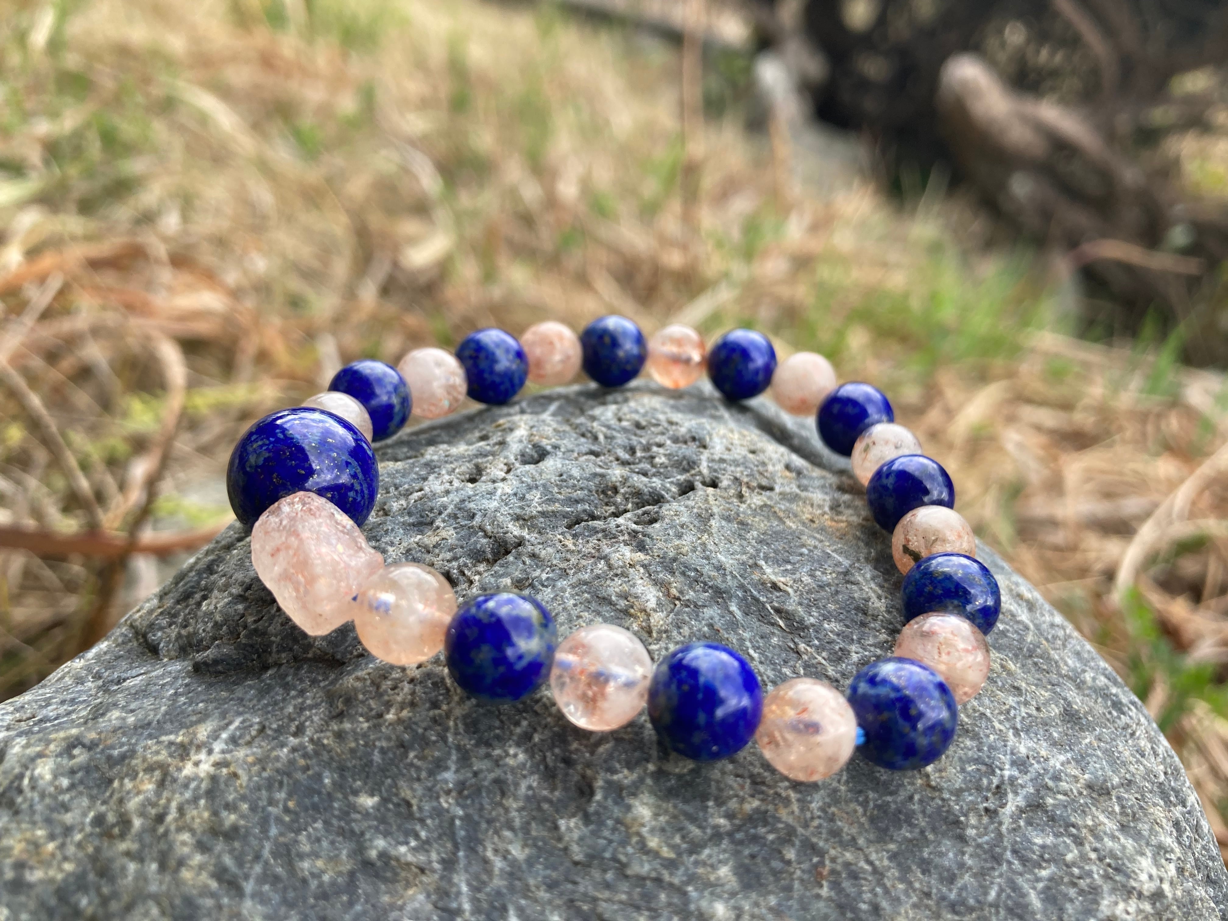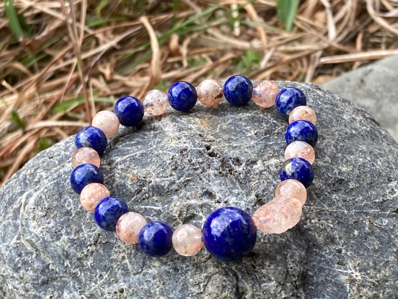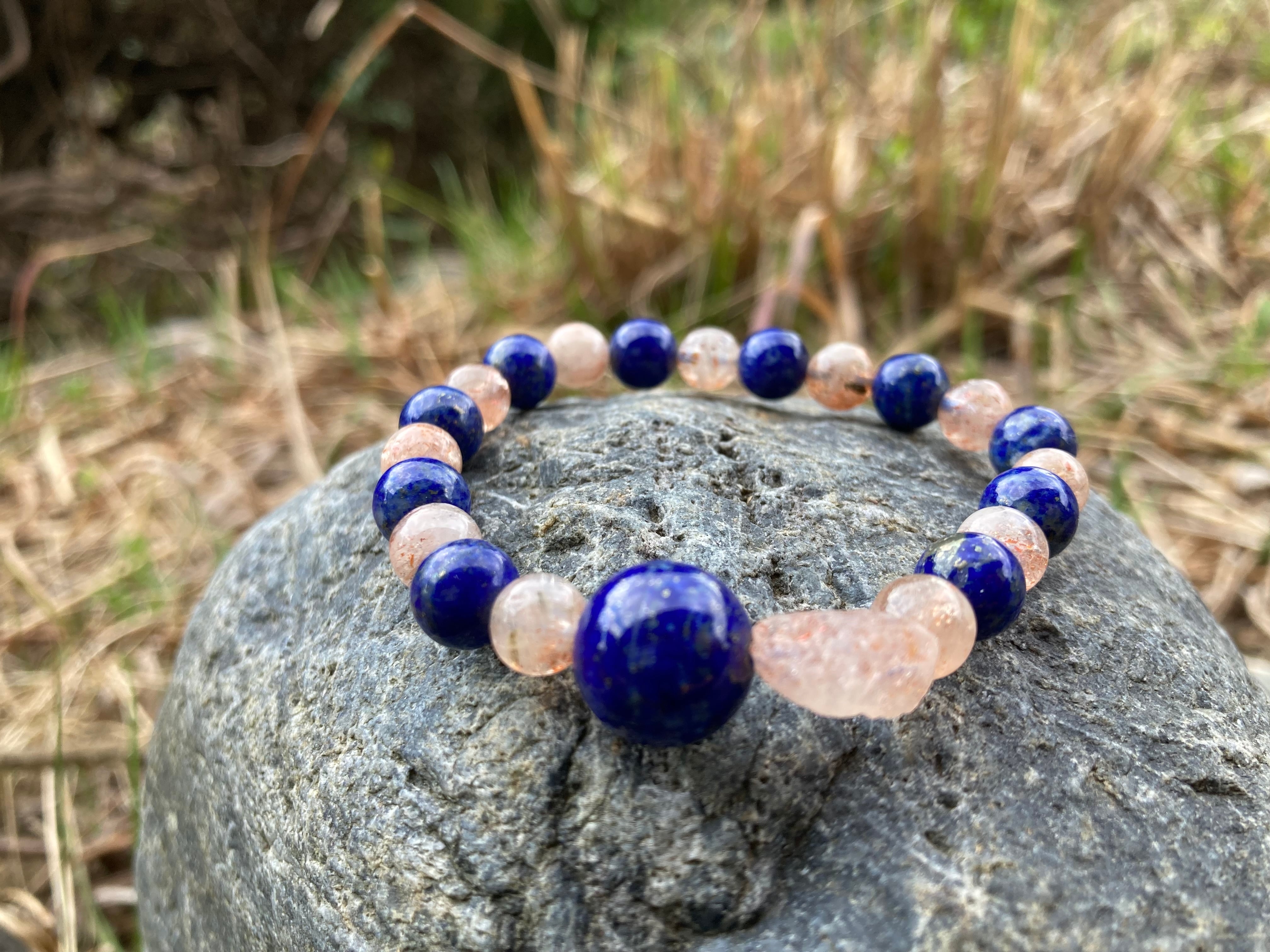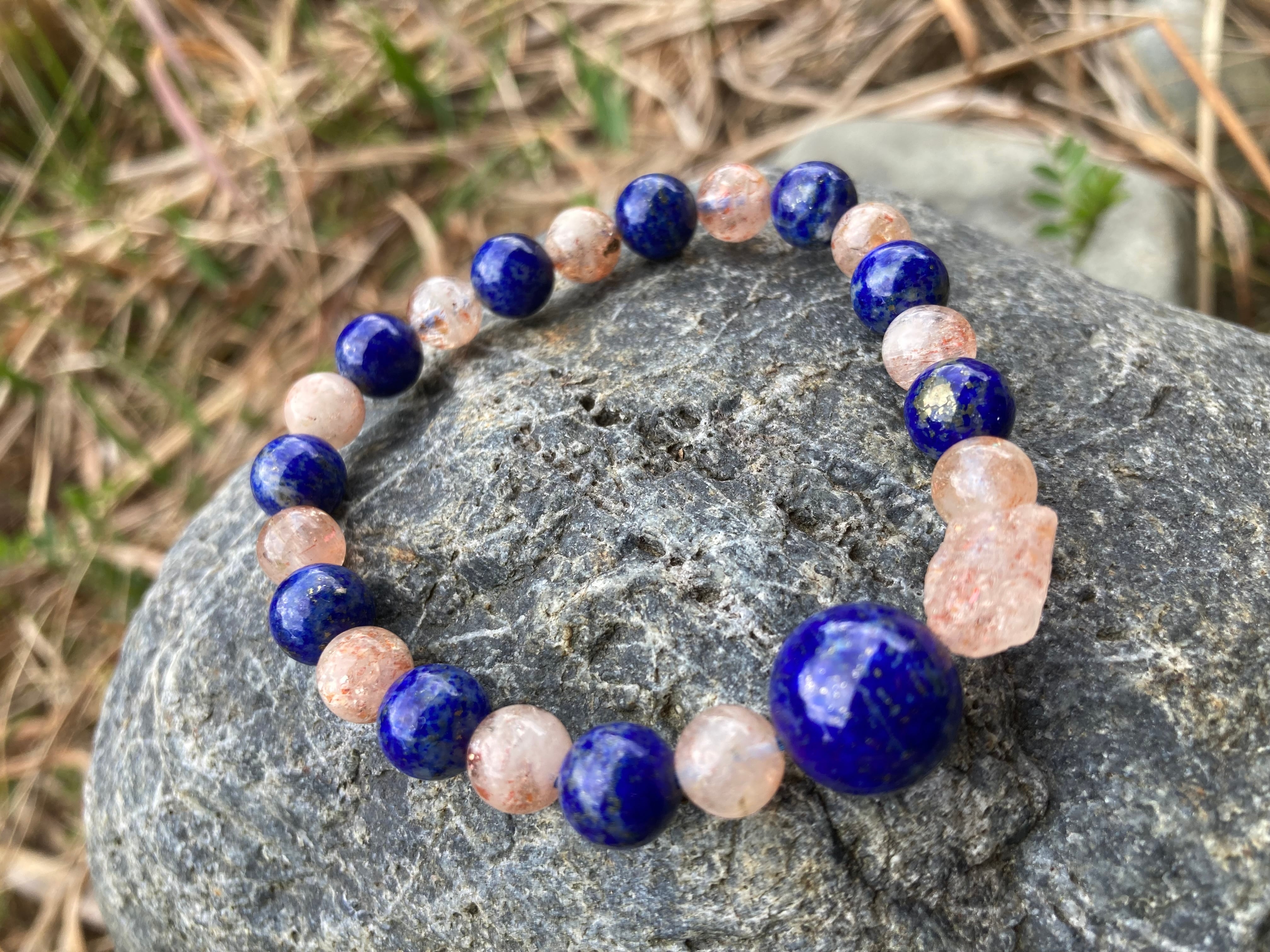 太陽の石であるサンストーン、サンストーンの良さを高めるラフ原石、エジプト文明で最古文献で登場する最初の人々に認知されたパワーストーンとして知られるラピスラズリを組み合わせたブレスです。