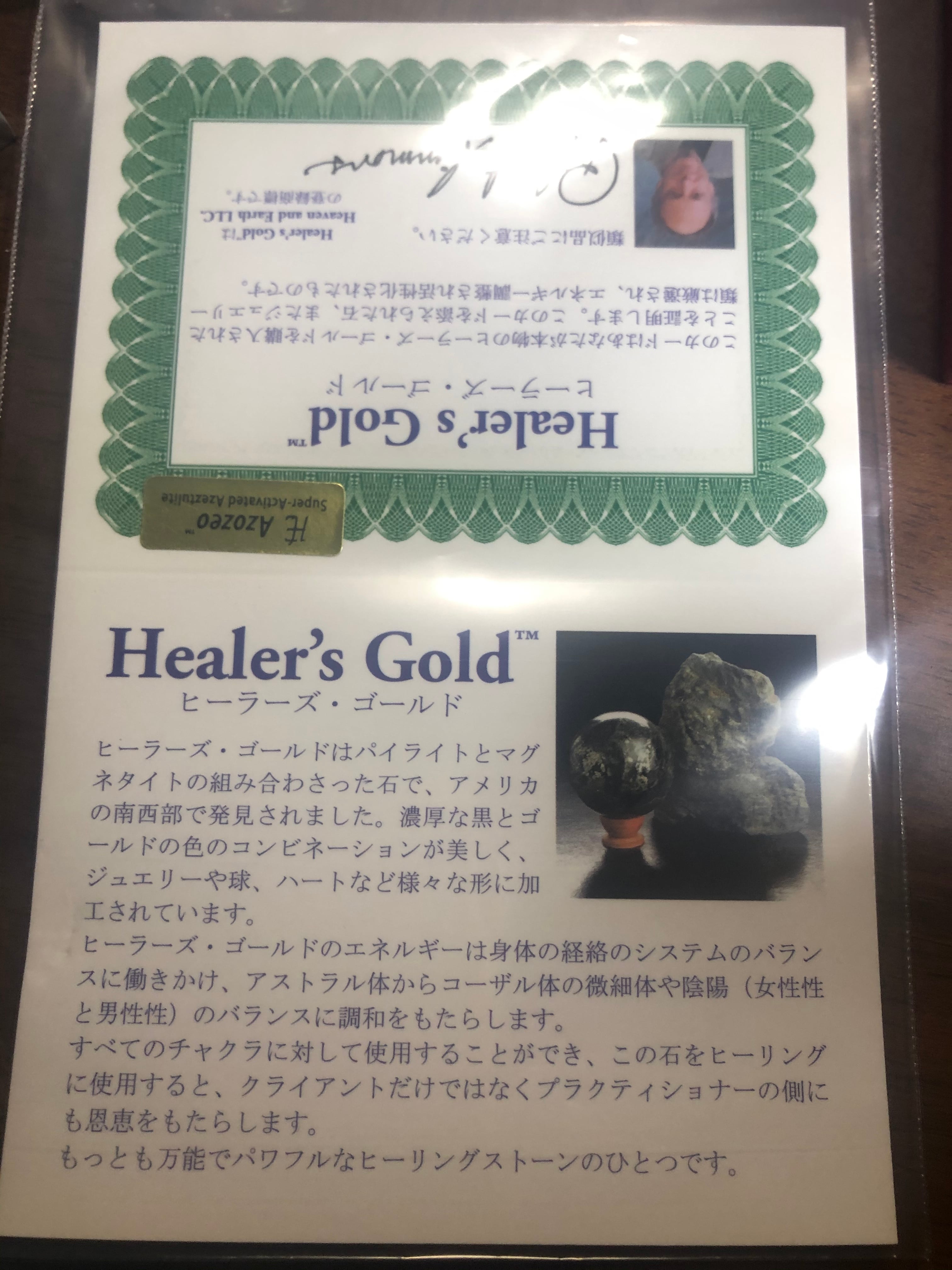 ヒーラーズゴールドはHeaven&earth社の登録商標でその証明書が付きます。