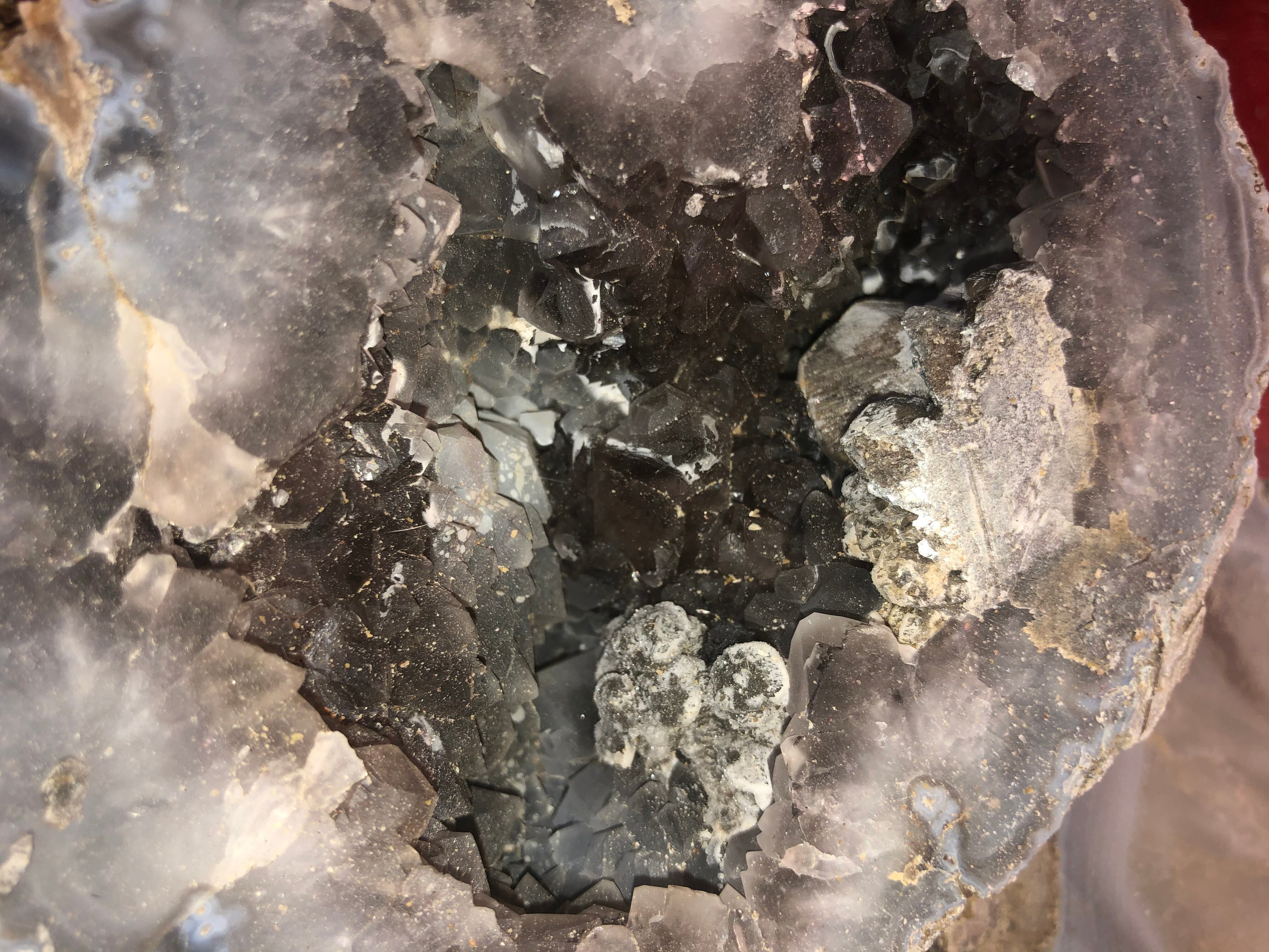 めのうと表現しますがいわゆる水晶結晶の原石となります。水晶結晶はこうやって晶洞を作り中の空間で水晶が育ちます。その中でもこれはアメシストの部類。