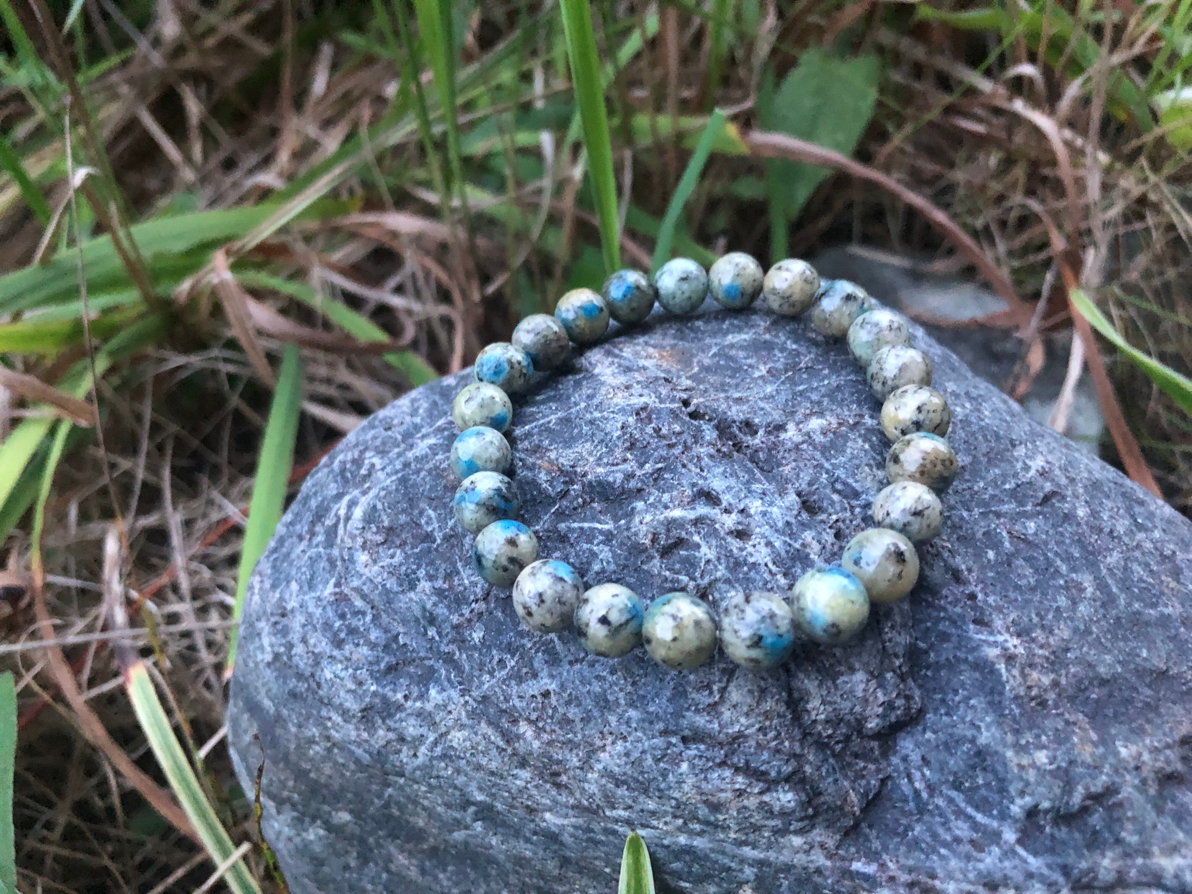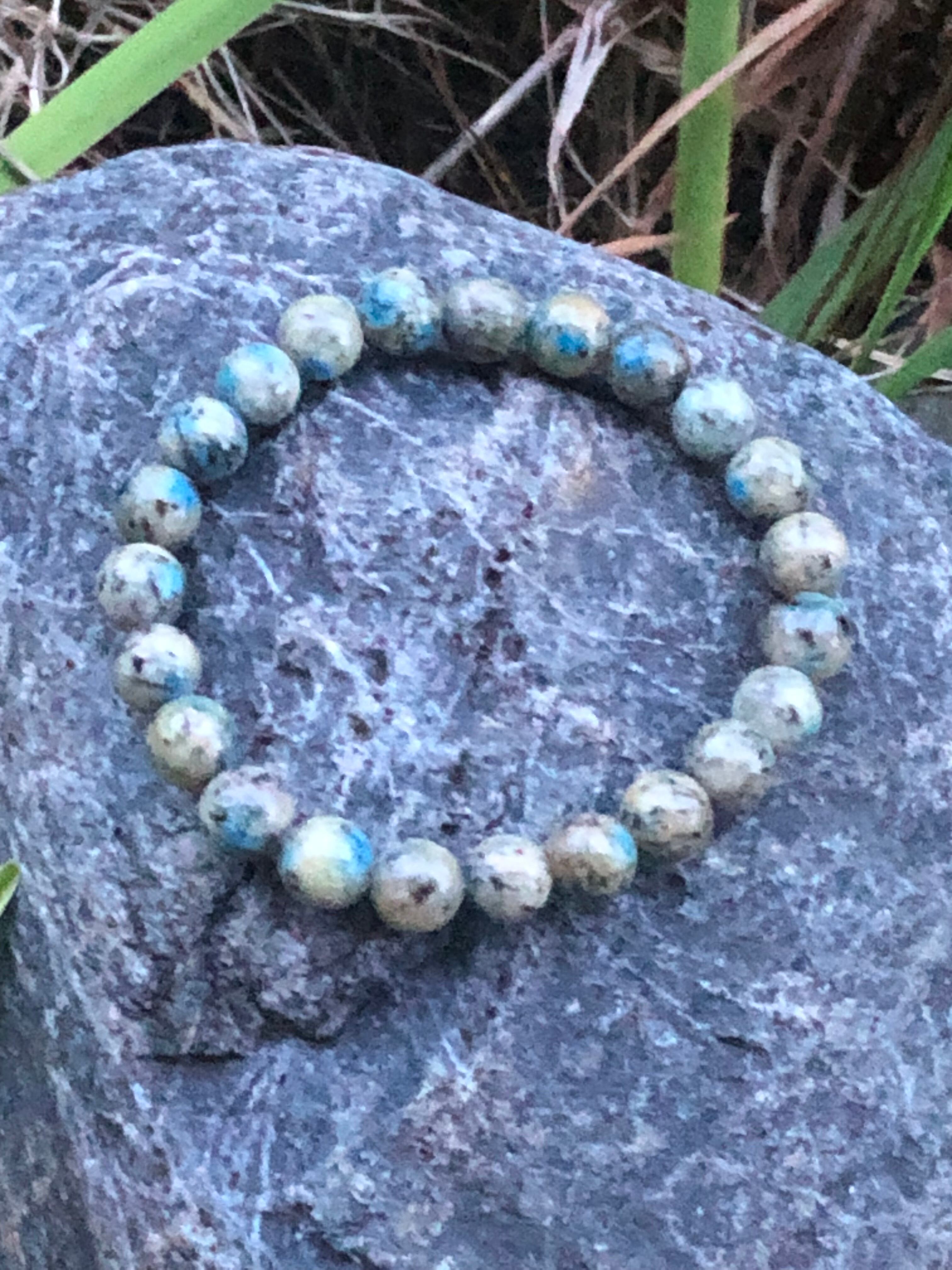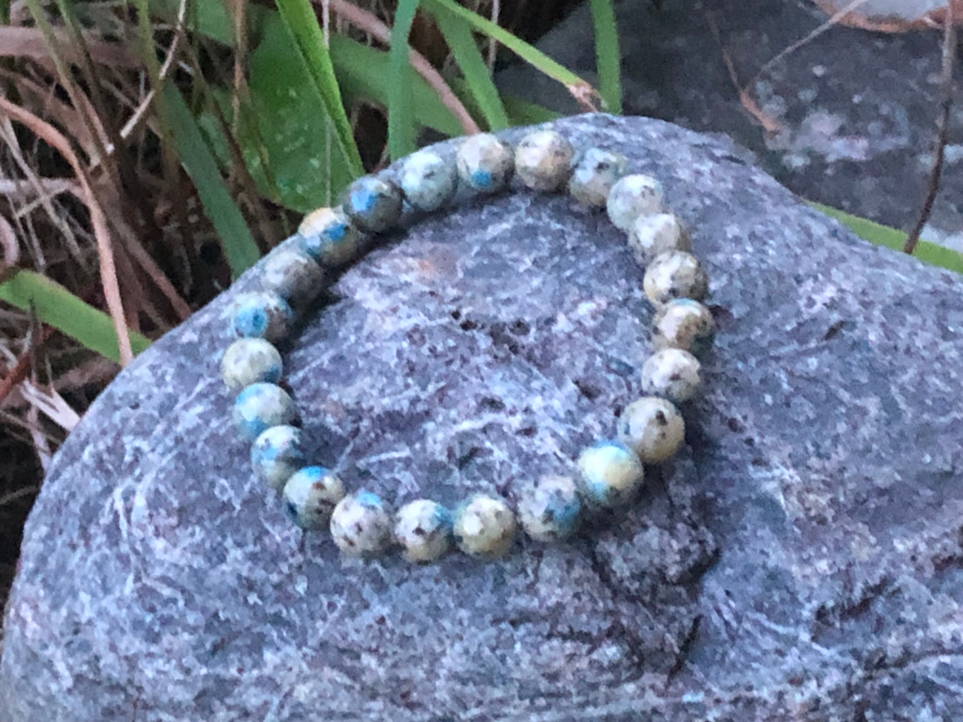 K2ブルーと呼ばれ、アズライトがグラナイト(花崗岩)にとりこまれたものです。そのため、パワーストーンの効果としてもこれらの両方の石の性質を持ち