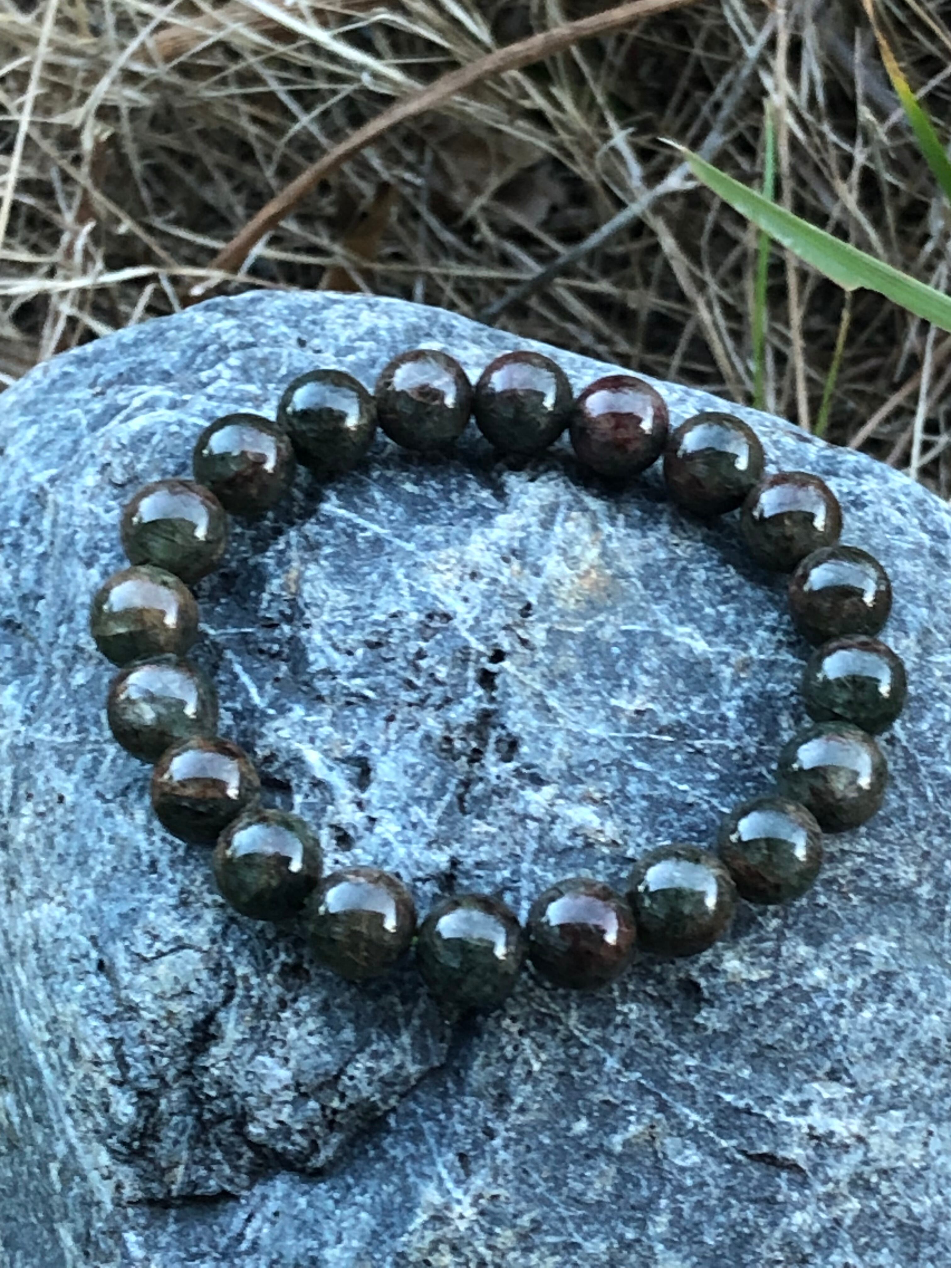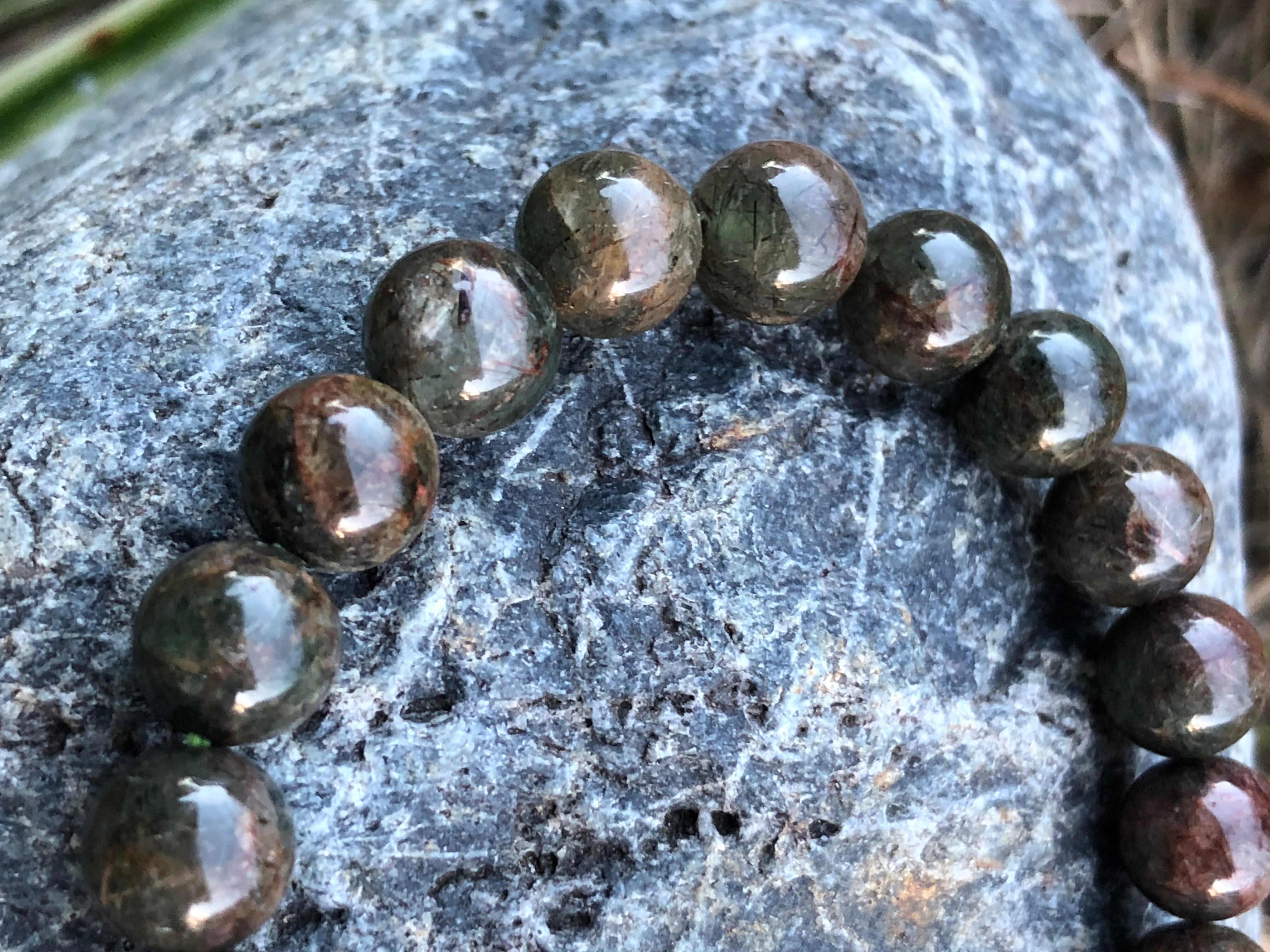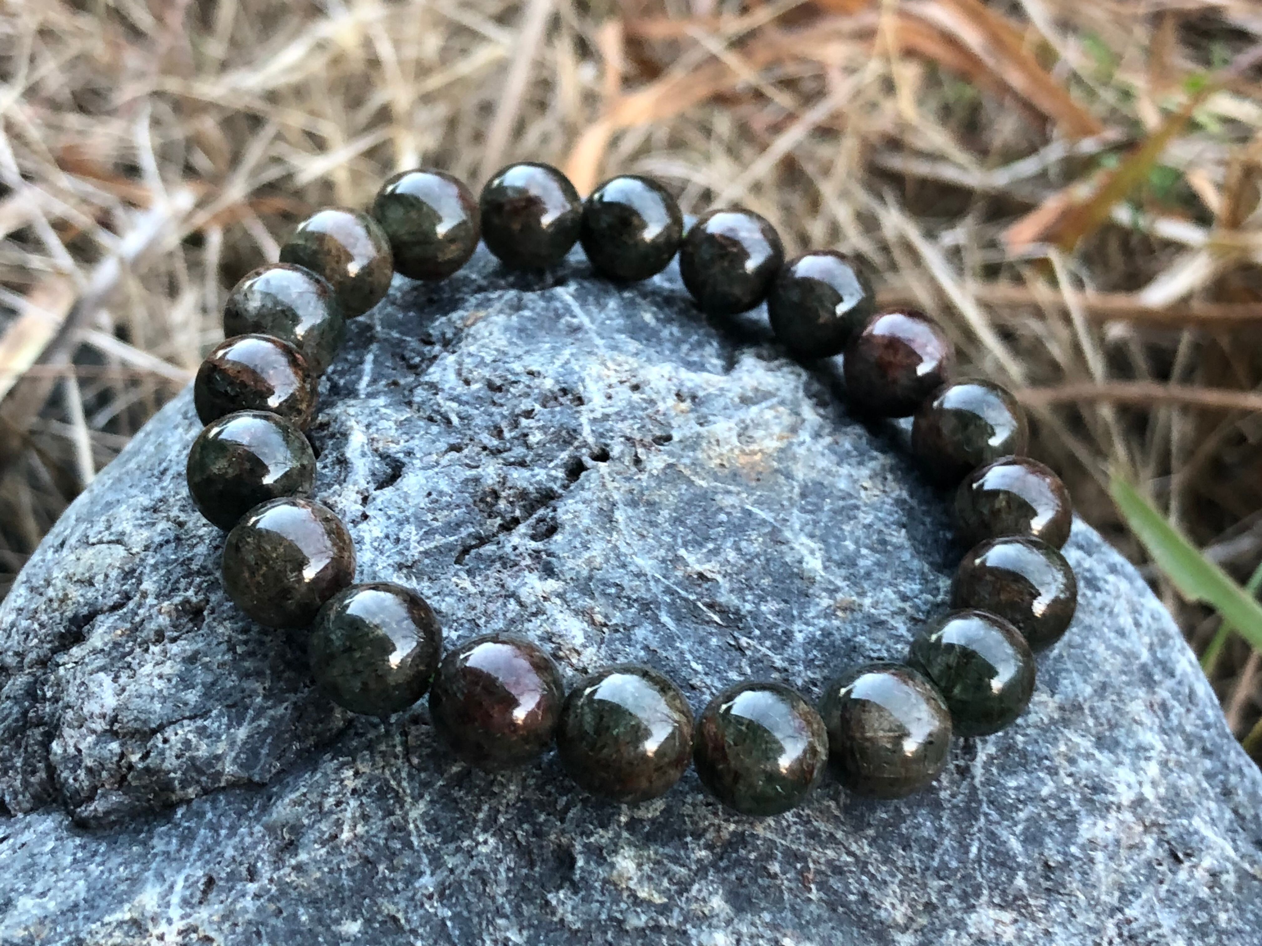 グリーンルチルは、現実感覚が保てない人にオススメの石で、コンピューターなどの仮想現実に生きている人を現実社会に引き戻し、生活になじめるようにサポートする石^ ^このブレスは内包部が褐色混じりのグリーンルチルで特にその特長がさらに顕著にでるでしょう^ ^