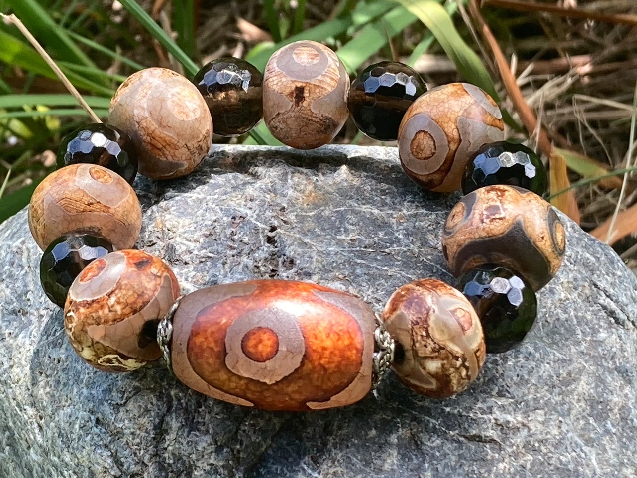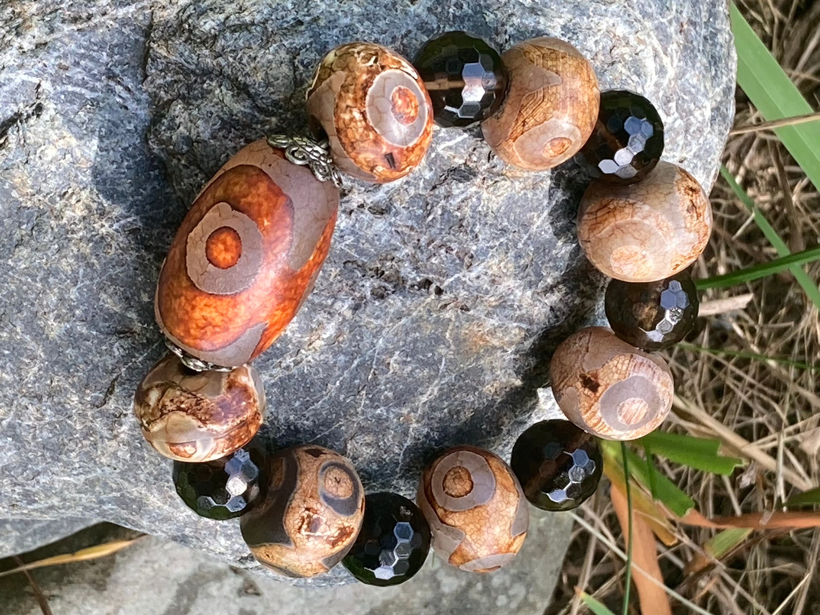 言われ佛の目と言われる代表的な天珠ですがこのブレスは大きさが圧倒的で周り玉のスモーキークォーツが14㎜の珠であるにもかかわらず小さく見えるぐらいです。